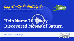 wayo(25)•in #threespeak•2283 days agoHelp Name 20 Newly Discovered Moons of Saturn[](https://3speak.online/watch?v=wayo/hpideofm) ▶️ Watch on 3Speak --- Hi Steemians, A team led and assembled by Carnegie Institute of Science's (Washington DC)...6wayo(25)•in threespeak•2283 days agoHelp Name 20 Newly Discovered Moons of Saturn[](https://3speak.online/watch?v=wayo/hpideofm) ▶️ Watch on 3Speak --- Hi Steemians, A team led and assembled by Carnegie Institute of Science's (Washington DC)...6