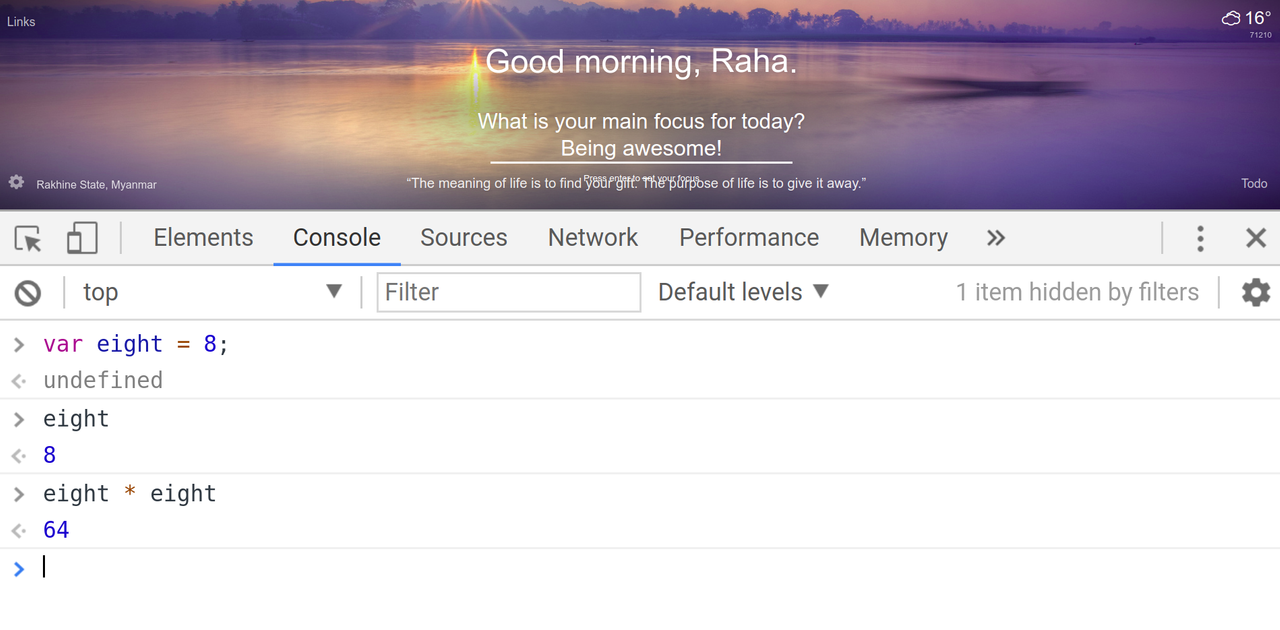 Let's see this in action. Open up your browser of choice, and open up the developer tools. My browser of choice is Chromium, I usually press ctrl + shift + j to open up the console. You can also press F12. This works in every browser, even Internet Explorer (please don't use IE though). Okay, so after pressing F12 you should see a window pop up with some tabs, press the console tab. And click just right of the little chevron symbol. Go ahead and write: