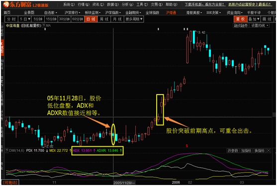 需注意的是,ADX的数值应大于ADXR;若小于ADXR,说明股价仍将反复。凡是ADX大于ADXR的数值,股价整理时间相对短一些,反之就相对长一些。 实战中,不要单独使用双蹄并进买进股票,因为他只是一个重要的参考依据,而不是入场的决定依据,决定进场的重要依据是:符合“量、价、线、形”四个条件的技术形态。把“双蹄并进”和其他技术手段结合起来使用,效果会更好些。