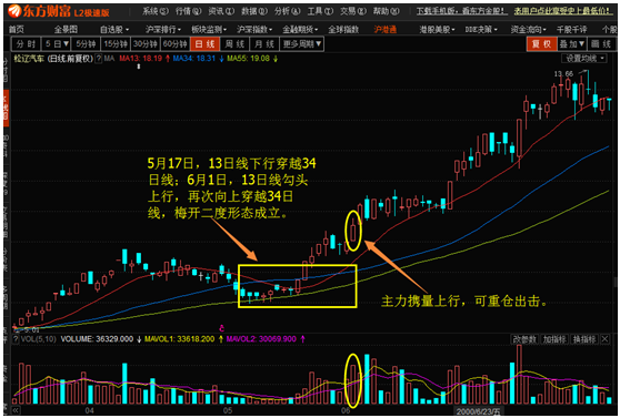 “梅开二度”的形态特征:    13日均线向上穿越34日、55日均线以后,股价滞涨回落,13日均线弱势下叉34日均线,随着股价的止跌企稳,13日均线勾头向上二次穿越34日均线。简单的说,就是在主均线上的13日均线下叉再金叉穿越34日均线,称之为“梅开二度”。