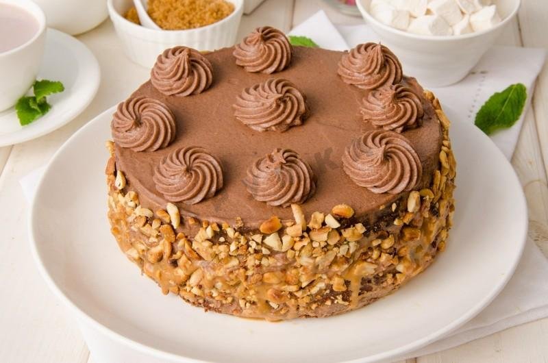 Step 29.Remove the cake from the mould and cover with chocolate cream, 2 tbsp cream put in a piping bag with a notched nozzle. Sides of cake sprinkle with chopped peanuts.