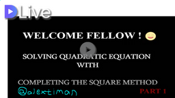 alextiman(25)•in #dlive•2770 days agoCompleting The Square Method[](https://dlive.io/video/alextiman/c6f22630-76d5-11e8-827c-49f76fdbeab3) Hi… This video gives the background of how to solve quadratic equation using the COMPL...52$0.02alextiman(25)•in dlive•2770 days agoCompleting The Square Method[](https://dlive.io/video/alextiman/c6f22630-76d5-11e8-827c-49f76fdbeab3) Hi… This video gives the background of how to solve quadratic equation using the COMPL...52$0.02