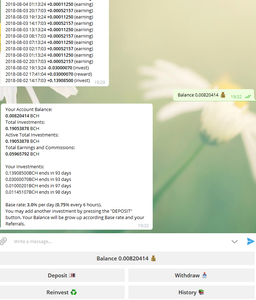 altcoinxl(25)•in #bitcoin•2721 days agoHow much can I make with $100 using the best Telegram BCH bot?What’s the plan? I have invested 100 dollars in the iCenter BCH bot. This bot will run for many months. I get 1.5% commission every day on the investment...21$0.00altcoinxl(25)•in bitcoin•2721 days agoHow much can I make with $100 using the best Telegram BCH bot?What’s the plan? I have invested 100 dollars in the iCenter BCH bot. This bot will run for many months. I get 1.5% commission every day on the investment...21$0.00