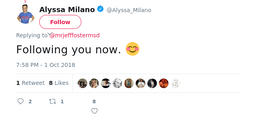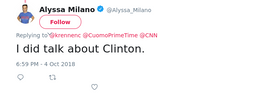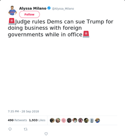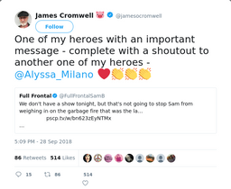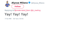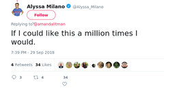 Sat Sep 29 01:41:22 +0000 2018 @alyssa.milano tweeted.RT @jamesocromwell: One of my heroes with an important message - complete with a shoutout to another one o...