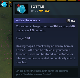 Bottle: It has a maximum of 3 charges, each charge rejects 90 life and 60 mana for 2.5 seconds, can be recruited with the runes bounty rune gives you 2 charges and the other runes of attributes, give you 3 charges if you take to the Base recovers 3 charges, if used to receive damage from an enemy hero the effect fades.