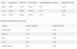 andrewsanderson(25)•in #new•3459 days agoAlexa Ranking - steemit.com - July 21 / July 22 / July 23 - Raw NumbersAlexa Traffic Ranks | Date | Global Rank | In the US | Bounce Rate | Daily Pageviews per Visitor | Daily Time on Site | |------------|------------------|-------...1andrewsanderson(25)•in new•3459 days agoAlexa Ranking - steemit.com - July 21 / July 22 / July 23 - Raw NumbersAlexa Traffic Ranks | Date | Global Rank | In the US | Bounce Rate | Daily Pageviews per Visitor | Daily Time on Site | |------------|------------------|-------...1