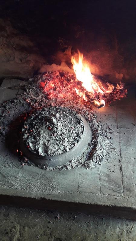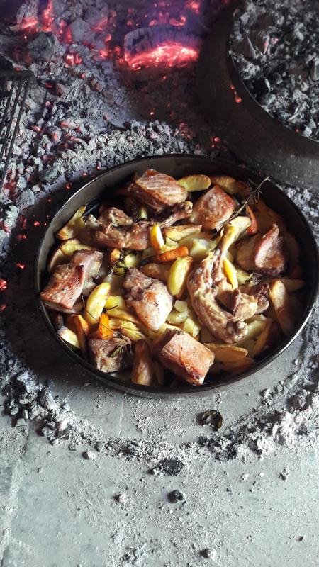 3) Place the meat and side dish (potatoes and vegetables) under cast iron bell and cover it with charcoal