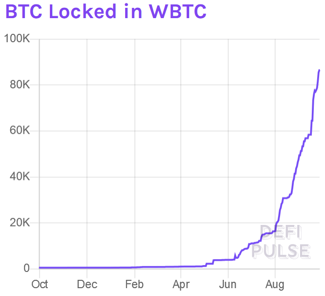 There’s little doubt that bitcoin — and in particular wrapped bitcoin — has spurred at least a portion of DeFi’s impressive growth over the past few months - USD 1.4bn worth of BTC is locked in DeFi today, or almost 13% of total value locked (TVL) in decentralized finance projects. As data from Defi Pulse indicates, the demand for wBTC began rising exponentially from the end of June onwards.