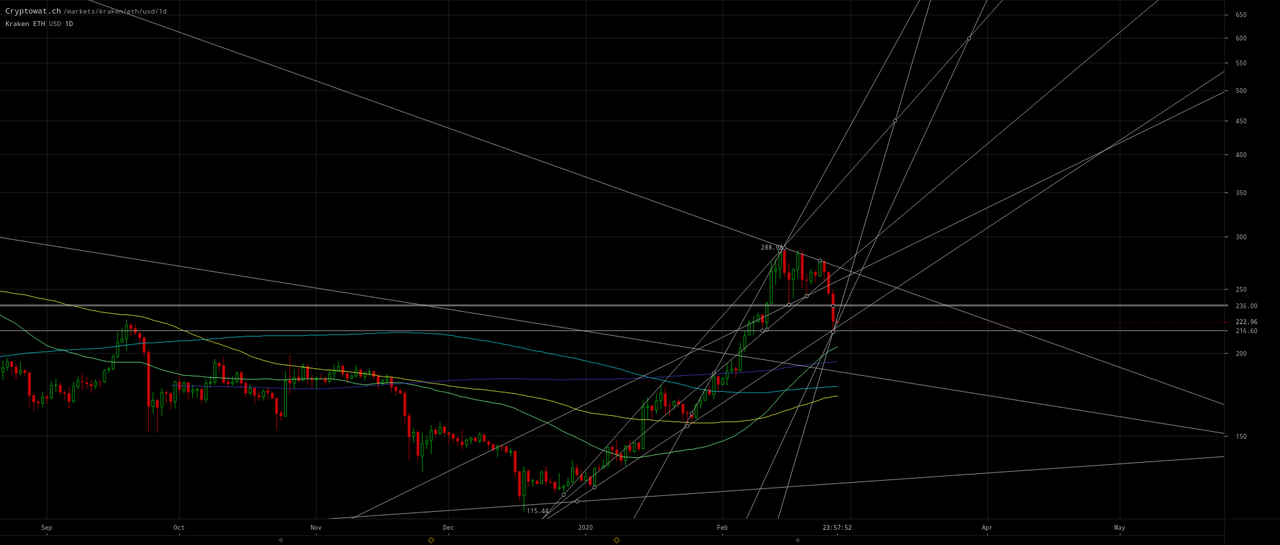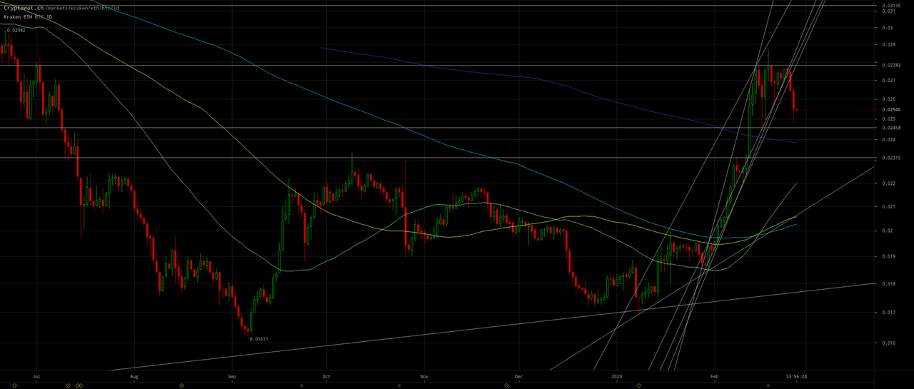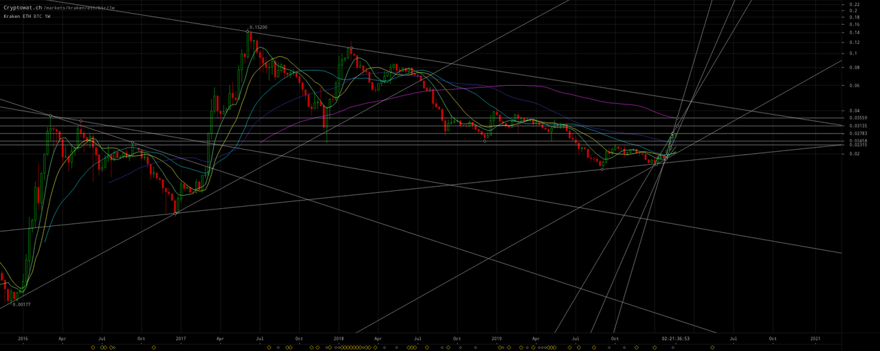 I have March 9 and 27 scenario targets annotated for a massive bullish reversal on the above as well as the following Ethereum charts which portend a rise of ETH/BTC to ~`0.047in March. ETH/USD and ETH/BTC may have bottomed or may decline between$195–$200and0.023–0.024` first: