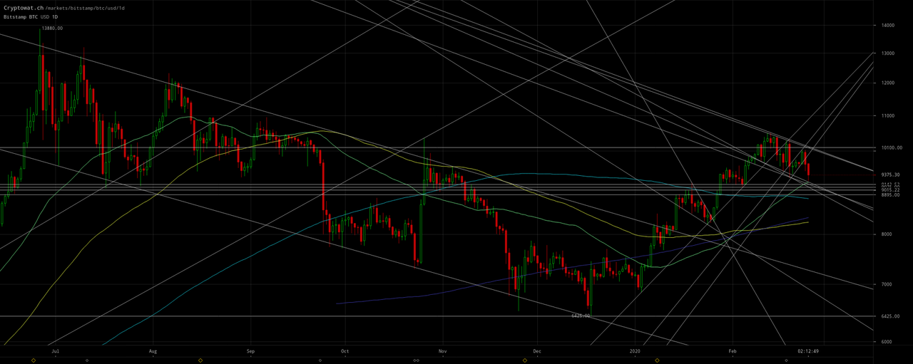 UPDATE Feb 25, 2020: Bitcoin is first headed down to the bottom of the declining channel charted in my prior February 21 update to the ~`$9k` price (between the 50 and 200 DMA as) I predicted in said update: