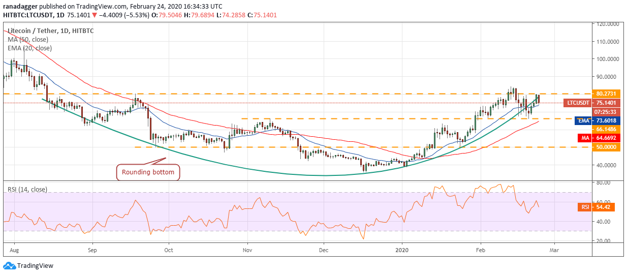 The LTC/USD pair will turn negative on a break below the support at