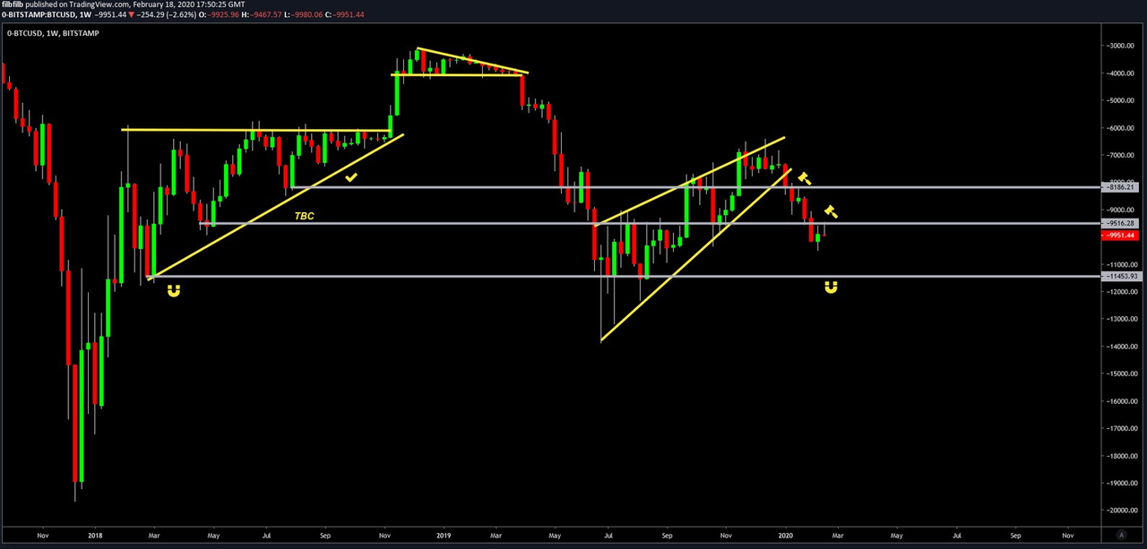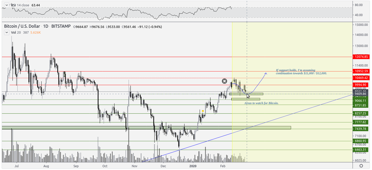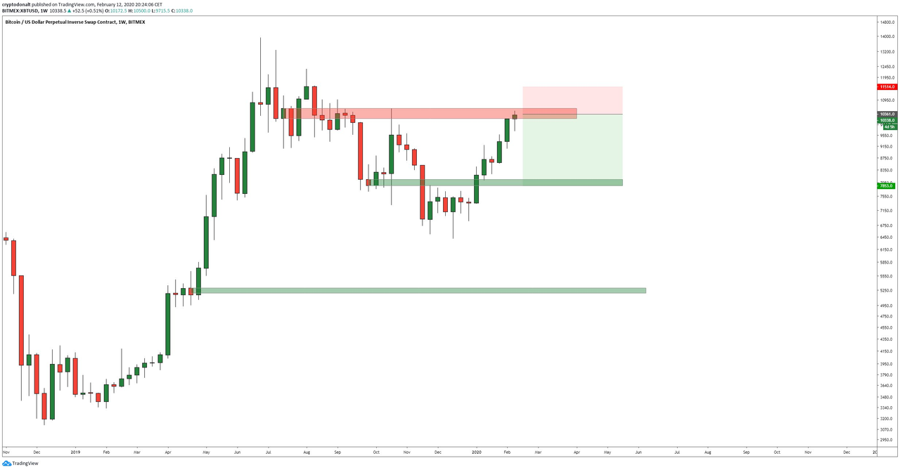 $9,500and$8,800areas on the weekly timeframe. If the price of Bitcoin can sustain support above these levels (preferably$9,500), a bullish continuation is still warranted.The critical resistance ahead is the