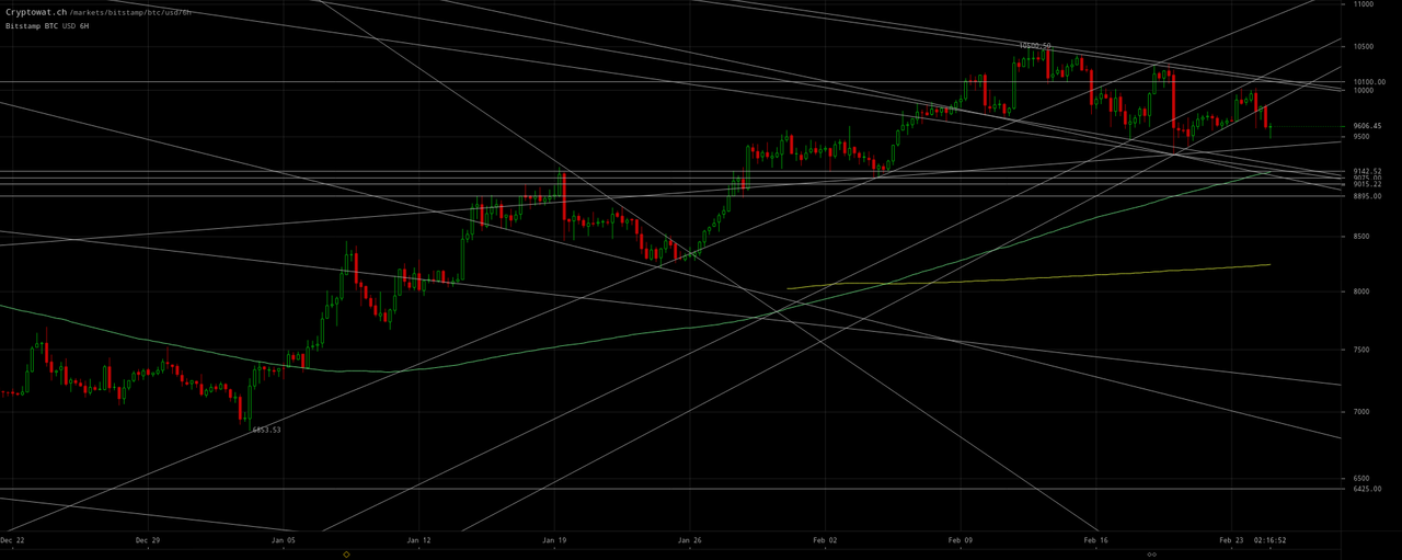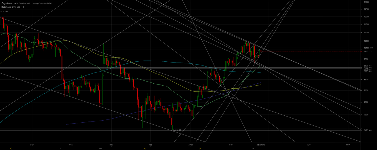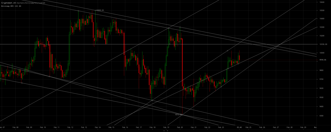 Bitcoin is moving up to at least ~`$10,100` at the top of the declining channel charted in my prior February 21 update: