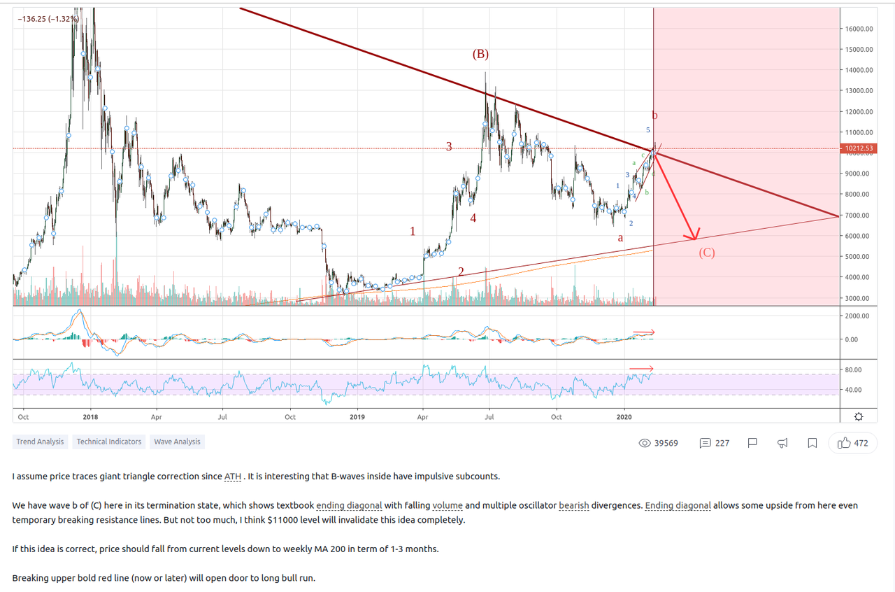 **to**$11,900` perhaps by February 17 to 20.Also there’s a rising, bearish wedge on the Bitcoin chart, which portends a peak and correction is near.