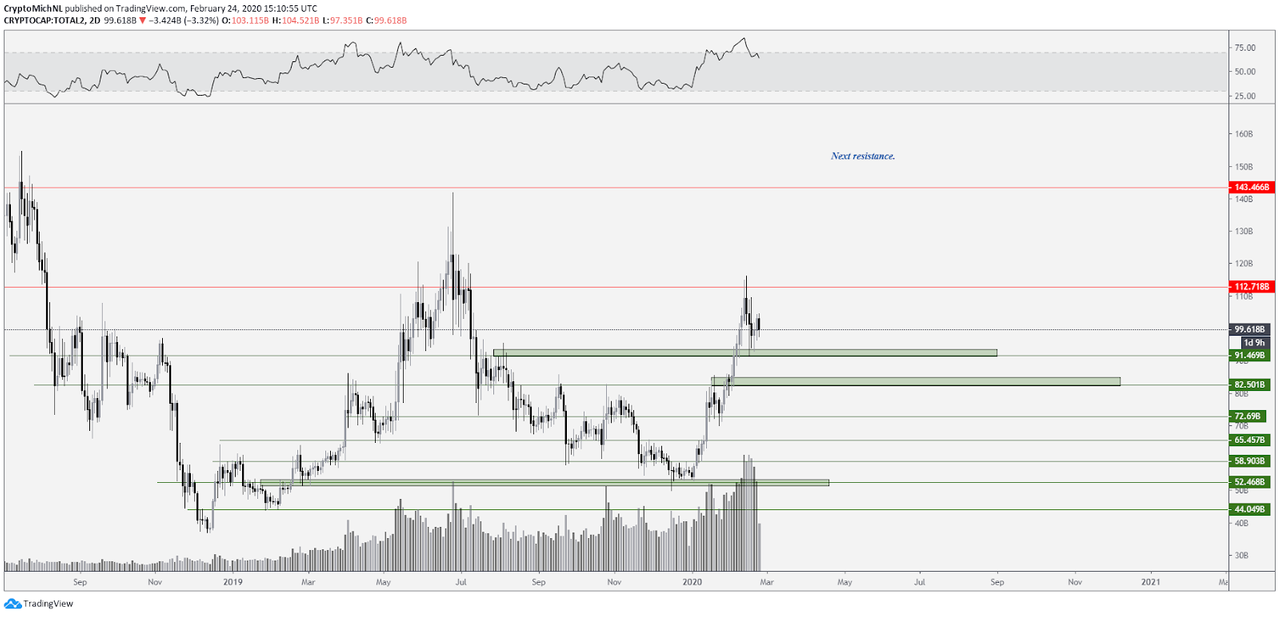 A similar outlook can be viewed on the altcoin market capitalization chart. Support is found at the $91 billion areas, through which consolidation started. Even a drop-down towards $82 billion wouldn’t be a bad outlook, as long as the total altcoin market capitalization doesn’t drop below that level […] If the $112 billion level [is breached to the upside], continuation towards $140-150 billion is on the tables for the altcoin market capitalization.