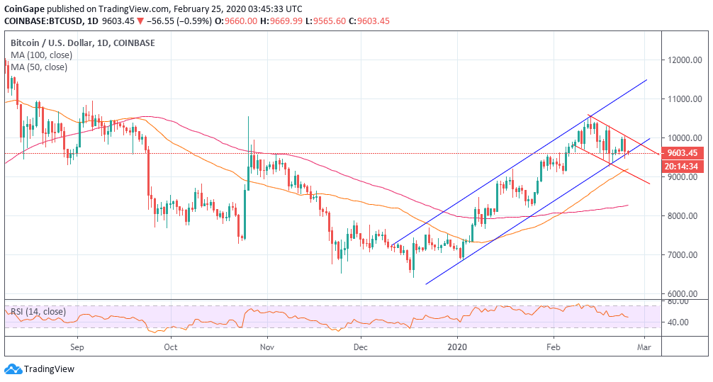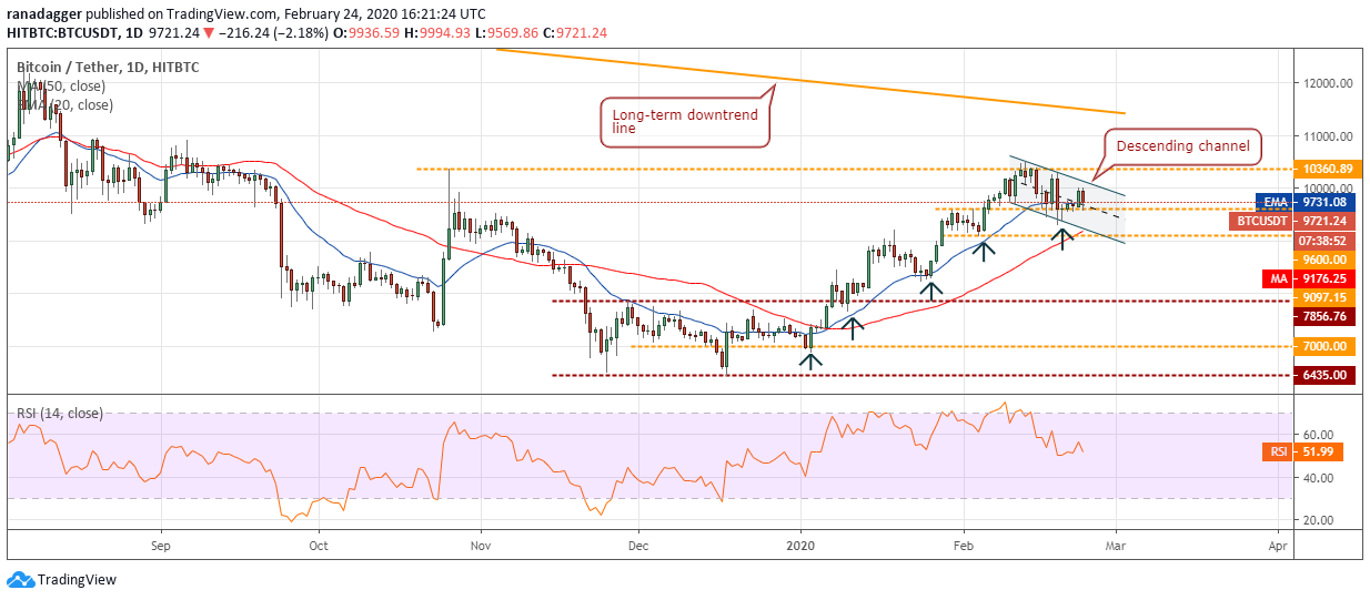 $9,600, a drop to the support line of the channel, which is close to the 50-day SMA at$9,176, is possible.