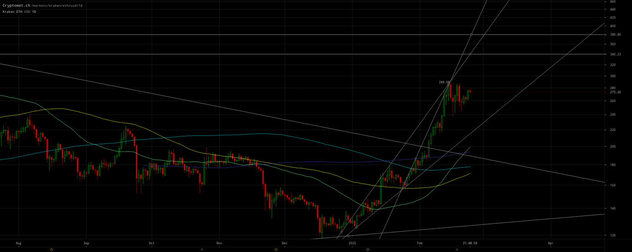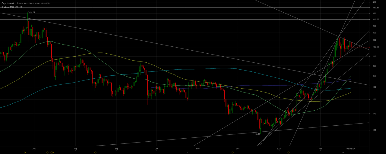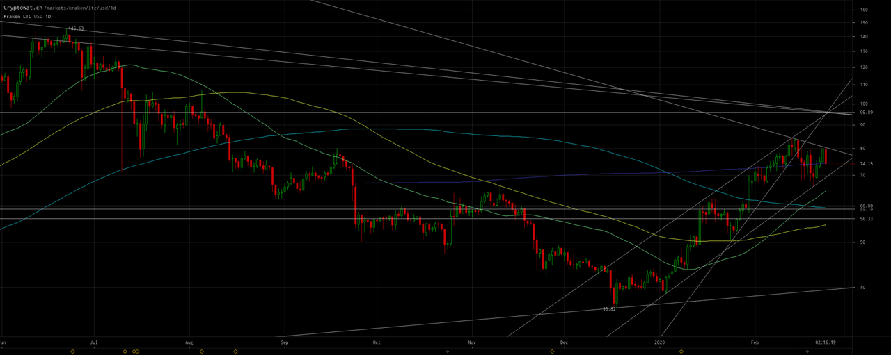 Thus what’s changed in interpretation from that update is the altcoins ostensibly already completed their corrections with the tops of their analogous channels ~`$95and$340–$380` respectively for Litecoin and Ethereum: