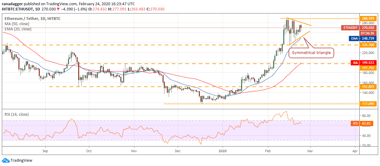 $288.59, the uptrend will resume. The triangle setup has a target objective of$330. If this level is crossed, the up move can extend to$366.Contrary to our assumption, if the bears sink the ETH/USD pair below the triangle, a drop to