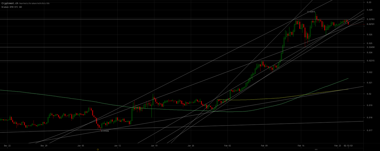 Bitcoin may be rejected at the top of the channel and decline for the lower low I had been contemplating. Or it may blast through lurching up to the next higher highs mentioned in my February 21 update. Possibly by February 28 back up to ~`$11.9k at the top of the wedge since the ATH in 2017, which with ETH/USD ~$420would also be0.035` for ETH/BTC.