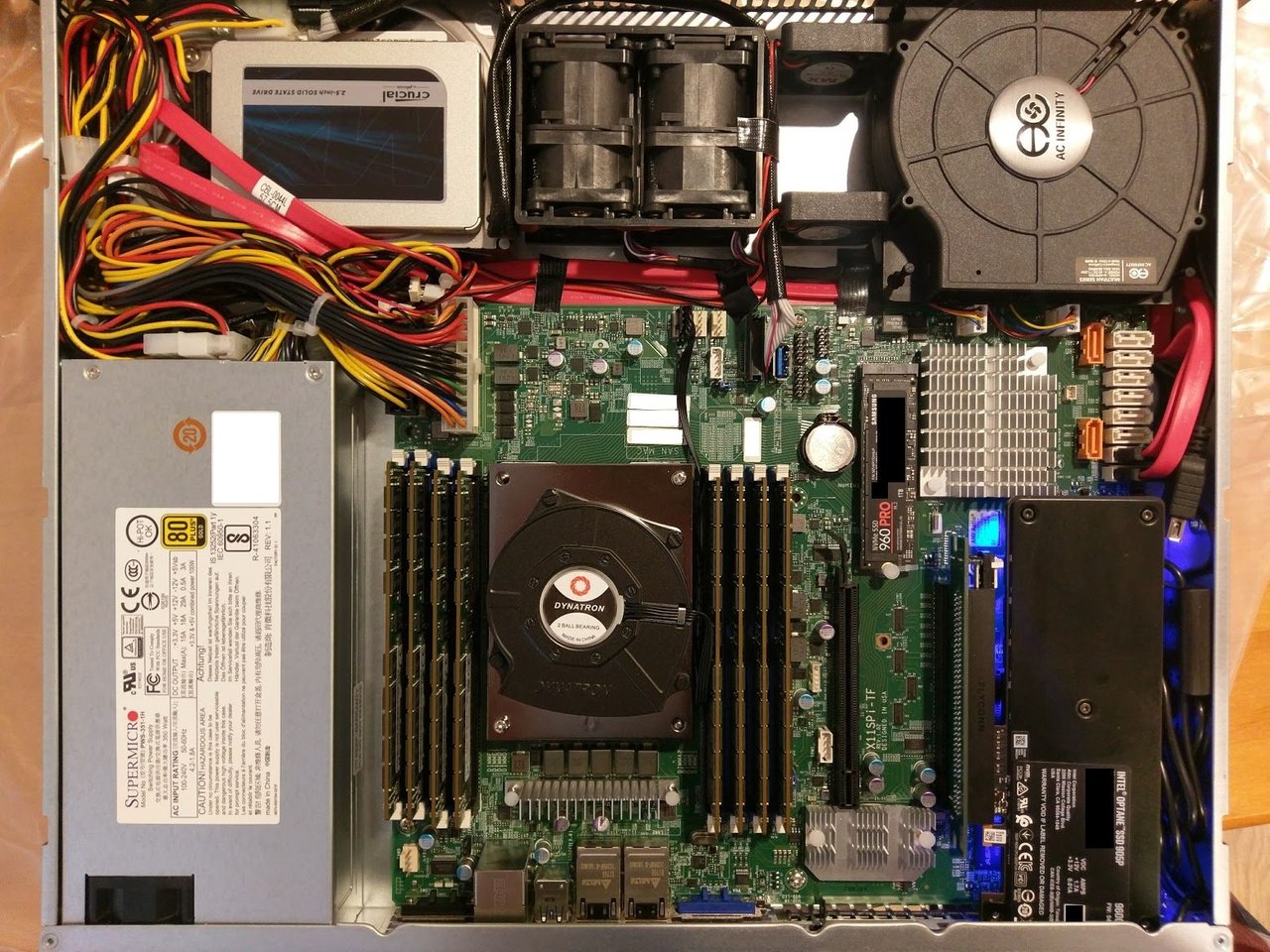 - A 90 degree PCIe riser is needed for the Optane card to fit it in 1U. Funny enough, my riser was a bit too short, so the Optane is a bit crooked in the server. Eh, it works!