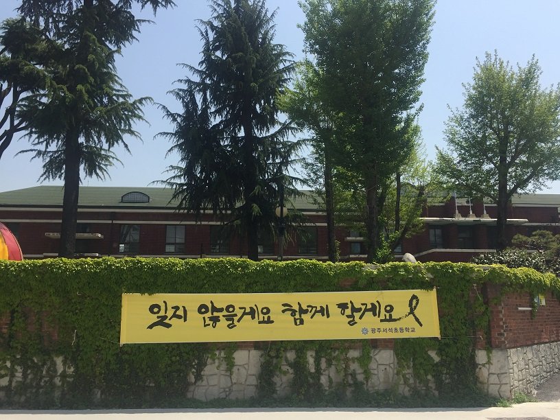 전당 주변을 걸었다. 둥치 큰 나무와 세월이 느껴지는 건물들. 오래된 도시의 정취가 고스란히 느껴졌다. 한 초등학교 교정에는 키 큰 히말라야시다가 몇 그루나 있었다. ‘세계에서 제일가는 슬기로운 서석 어린이’. 교문 바로 위 아치형 구조에 교훈처럼 보이는 문장이 보였다. 그리고 한쪽 벽을 따라 걸린 노란 바탕의 현수막에는 ‘잊지 않을게요 함께 할게요’라는 문장이 쓰여 있었다. 생소한 풍경이었다. 내가 사는 도시에서 그러한 모습을 본 적이 있나 아무리 생각해봐도 기억이 없었다.