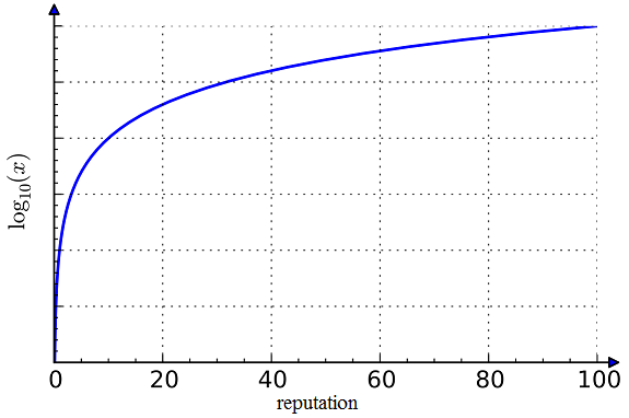 声誉的点数在基于数学以10为底的Log 函数。下面是一个 Log函数的呈现方式。