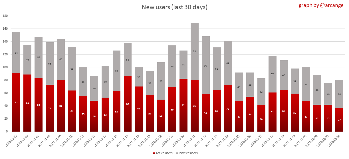 The grey part of each column indicates how many accounts are inactive (those who have not posted, commented or voted the last 30 days).