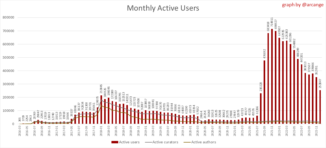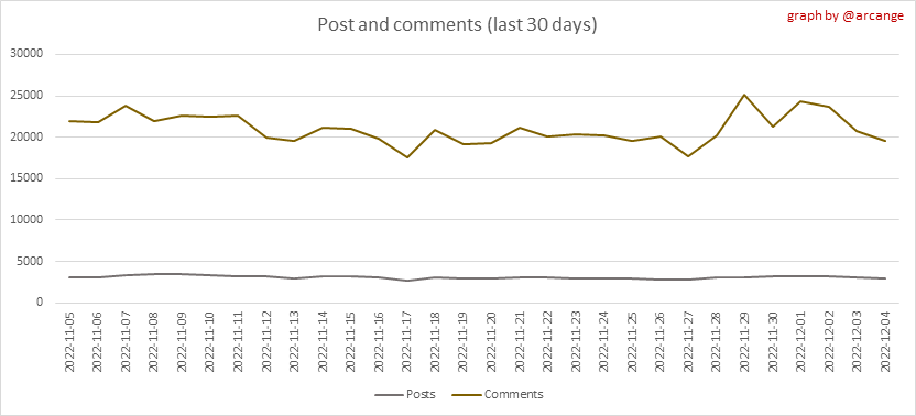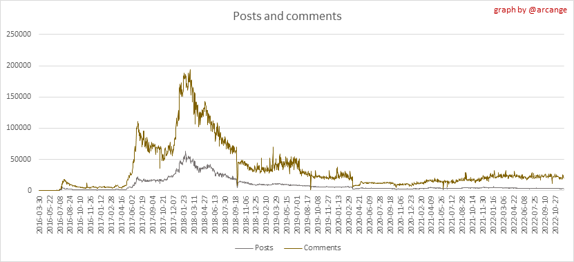 These graphs show the evolution of posts and comments for the whole blockchain lifetime and the last 30 days.