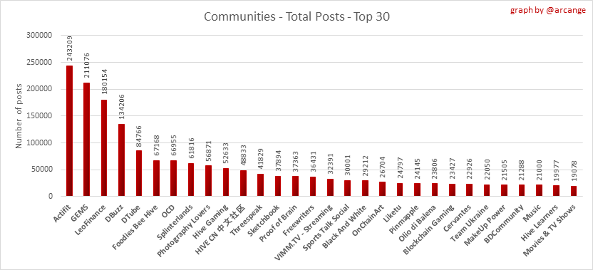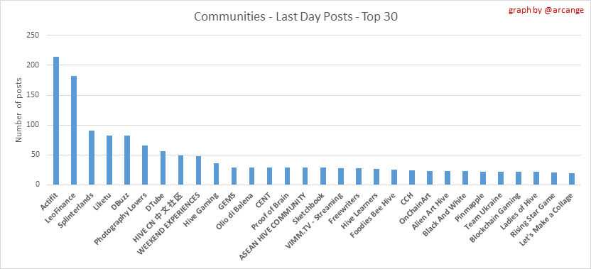 These graphs show the most active communities by number of posts (blockchain lifetime and last day).