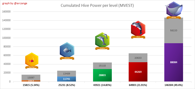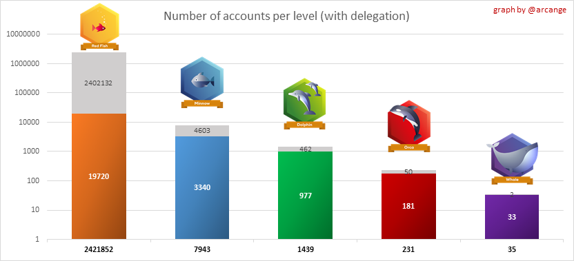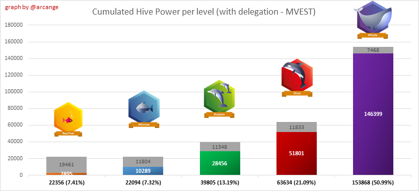 This graph shows the distribution of Hive Power cumulated per account level. The left graph shows the distribution without taking into account any delegation made or received by the accounts. The right graphs take into account delegation, adds received HP delegation and subtracts given HP delegation.