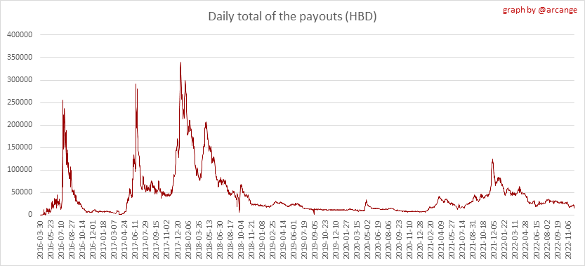 These graphs show the total of the distributed payout (posts and comments) for each day.