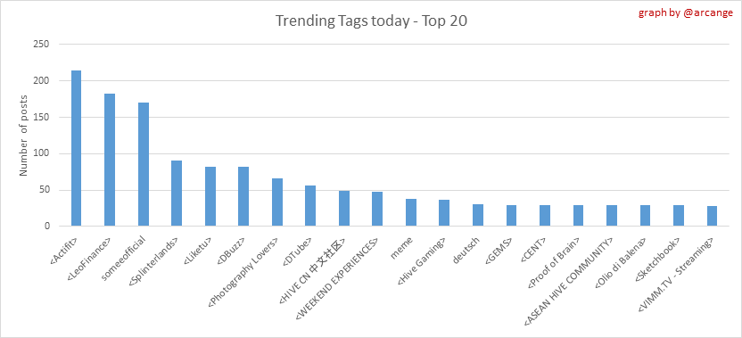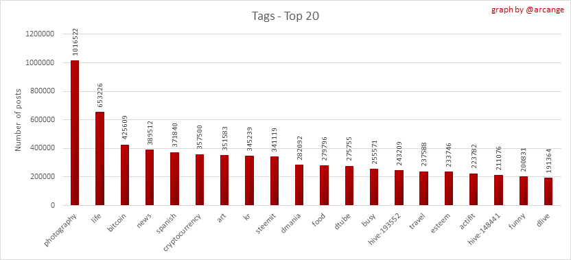These graphs show which main tags have been the most used for publishing posts for the whole blockchain lifetime and the last day.