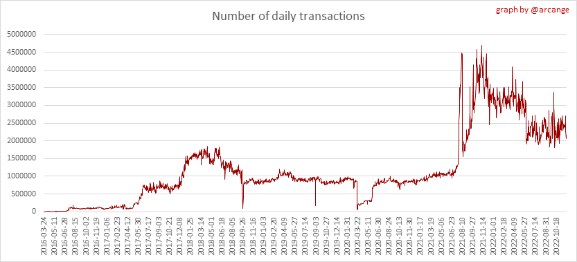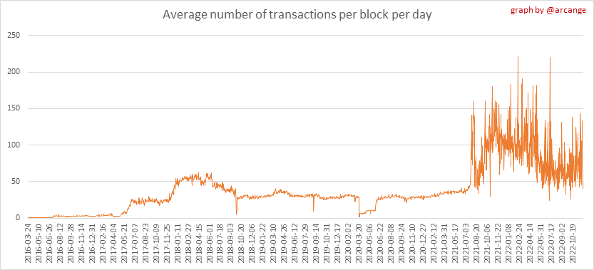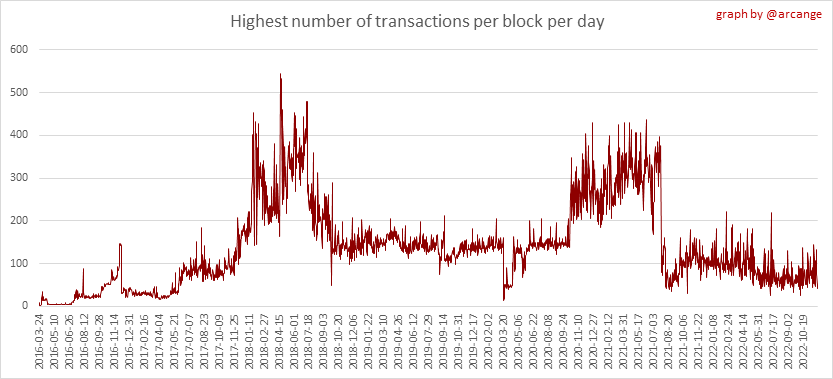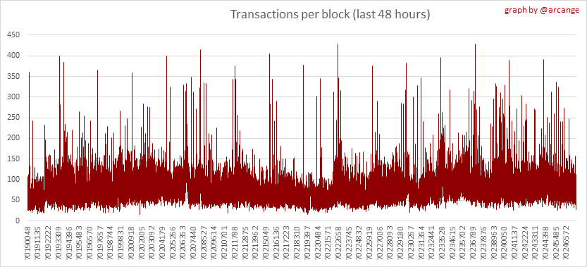 These graphs show the number of transactions per day, and the highest number of transactions per block, the average number of transactions per block, and the number of transactions per block for the last 48 hours. This gives you an idea of the whole activity on the blockchain.