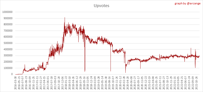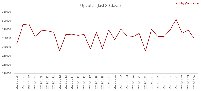 These graphs show the evolution of curation (upvotes) for the whole blockchain lifetime and the last 30 days.
