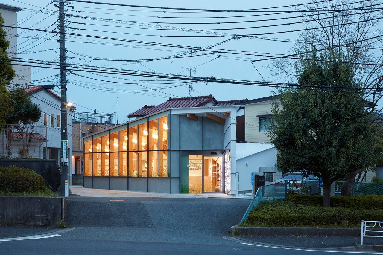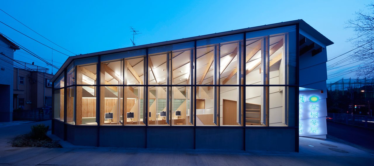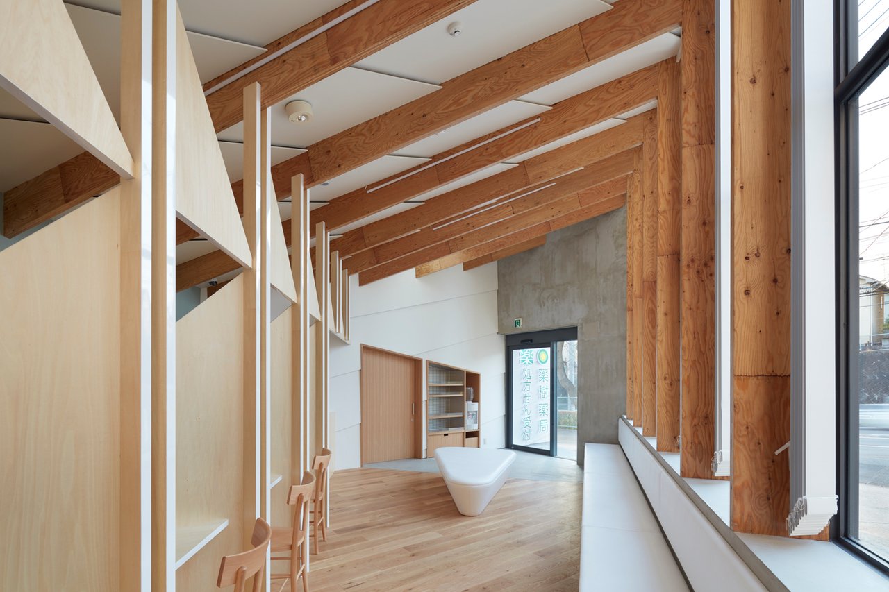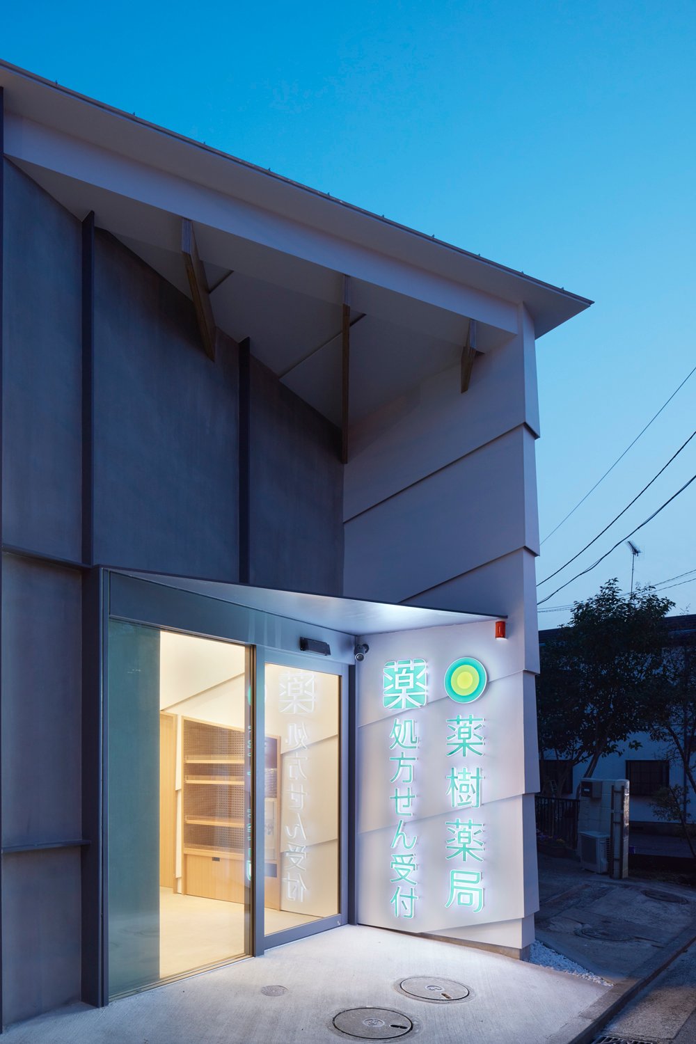 The project is a single-story wood-framed pharmacy located between a highway and a residential neighborhood.
