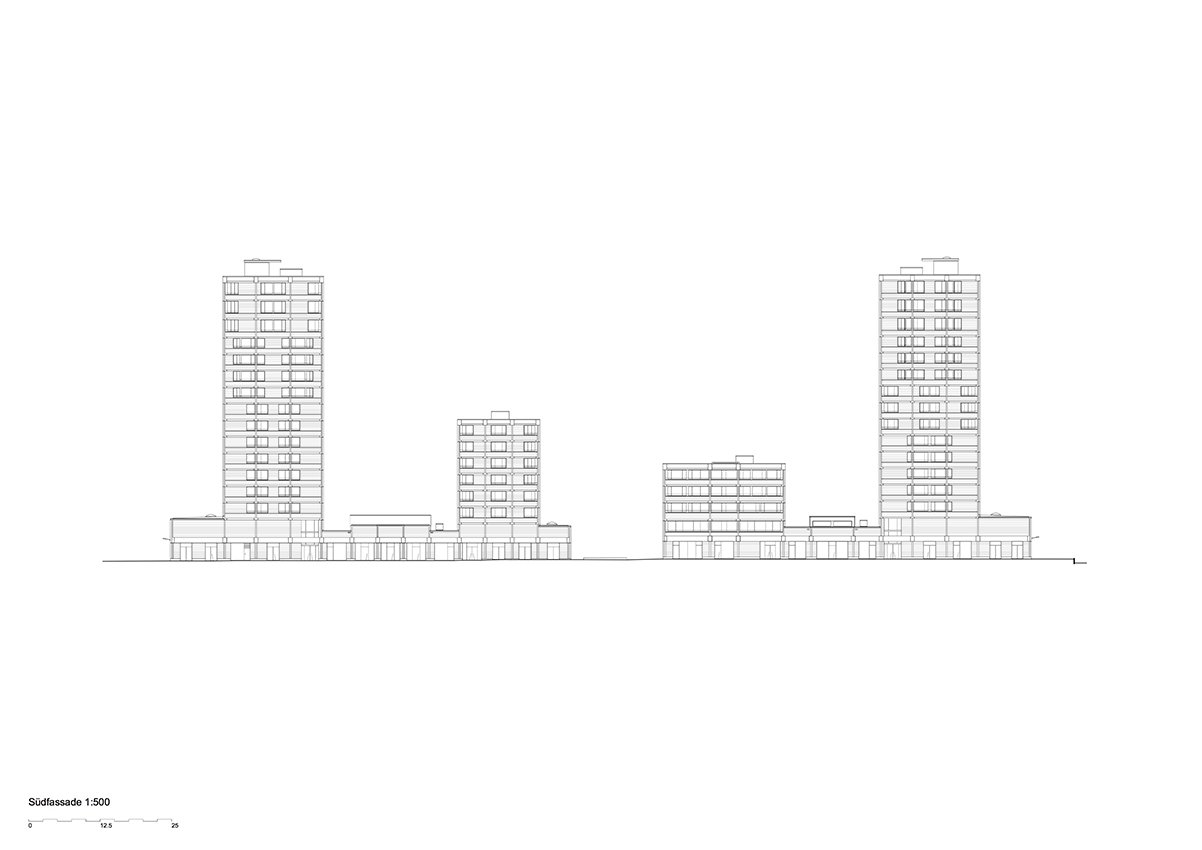 The structure of the residential buildings with supporting pillars and partition walls permits a wide variety of different housing types. From a one-room studio to a six-room residential unit, diverse housing with different standards is offered for many different types of living and a broad target audience. Depending on the type of layout, the exterior rooms are carried out as open balconies or glazed sun rooms. Three-part stairwells provide access to the small residential units oriented diagonally at the building ends and the continuous residential units from east to west in the building centre. Thanks to the orientation of the slim residential buildings perpendicular to the street, all residential units enjoy diagonal views of the track field and over the city. Orienting the main residential side away from the street simultaneously ensures noise control. Packages of similar storeys are vertically stacked. The stacking principle provides freedom in adapting the housing portfolio. Since it is visible on the façades, the principle of stacking defines the appearance of the structures. The top three residential storeys of the high-rises exhibit a greater room height and accentuate the vertical termination.