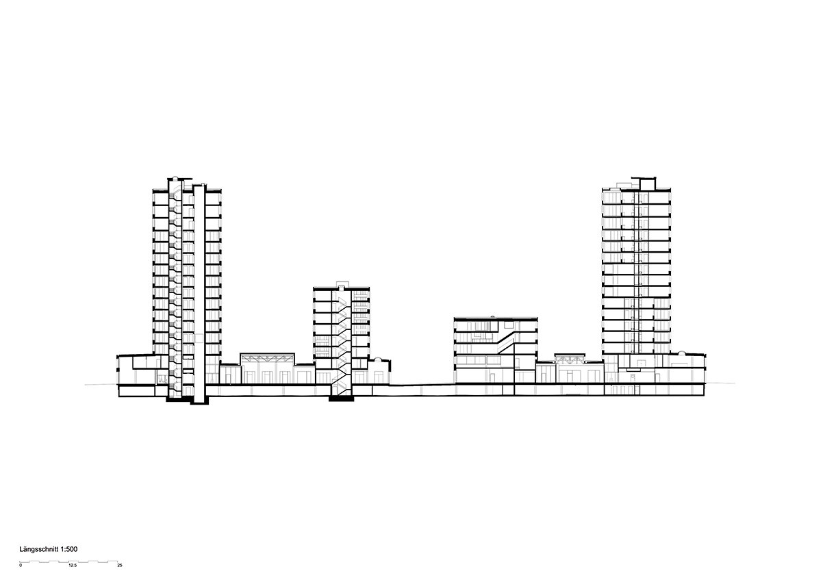 The lateral alleys and squares form a sequence of elongated outdoor spaces and, together with the interior access lanes, segment the base structures into various fields of development and use. Large hall structures are located between the high-rise buildings, naturally lit with a saw-tooth roof and lanterns. Commercial space is arranged in the lateral base structures, which can be divided into small units depending on the requirements. Gastronomy operations linked to the exterior are in the foreground on the central square, while sales and service facilities are intended for the boundary areas. As a result, the ground floor and surroundings are home to invigorating uses on all sides.
