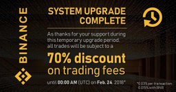 askshani(25)•in #cryptocurrency•2895 days agoBinance Trading Fee 70% off for next 14 days...Binance is giving a flat 70% OFF until 0 UTC, 24th Feb, 2018. So you can start your trades now. This discount is like a compensation for that delay....0askshani(25)•in cryptocurrency•2895 days agoBinance Trading Fee 70% off for next 14 days...Binance is giving a flat 70% OFF until 0 UTC, 24th Feb, 2018. So you can start your trades now. This discount is like a compensation for that delay....0
