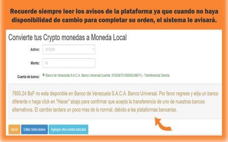 Podrá ver un aviso que le informará si tenemos disponible o no la cantidad de bolívares que desea recibir. En caso de que no haya disponibilidad si le da click en Hacer estará aceptando recibir una transferencia que podría tardar en completarse, ya que posiblemente tenga que hacerse desde otro banco diferente al seleccionado.