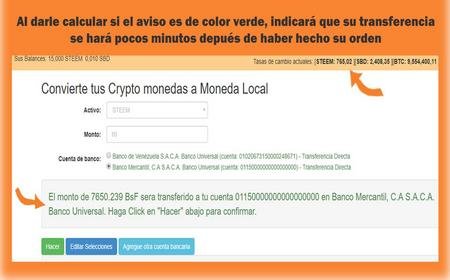 Si al darle click en calcular ve un aviso de color verde, quiere decir que se le hará la transferencia solicitada en los próximos minutos después de recibir su orden. También podrá ver el monto que recibirá el cual es calculado según la tasa en nuestra plataforma para ese momento. Nuestras tasas son automáticas por lo que siempre están variando. Sólo necesita darle click en Hacer y listo, ya habrá puesto su orden de cambio.