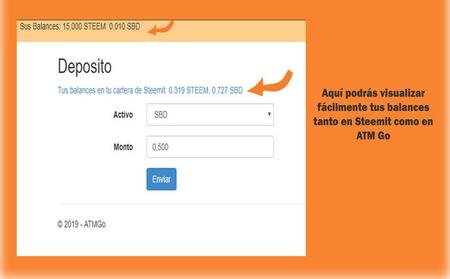 Al darle a la opción de depósito podrás visualizar fácilmente tus balances tanto en steemit como en ATM Go, seleccione el activo que desea depositar (STEEM o SBD), la cantidad y presione enviar.