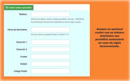 Podrá visualizar algunos campos opcionales, nos gustaría que pudieran agregar al menos su número de teléfono para contactarlo en caso de algún inconveniente o en caso de utilizar nuestros servicios de PAGO MÓVIL también lo necesitaremos.