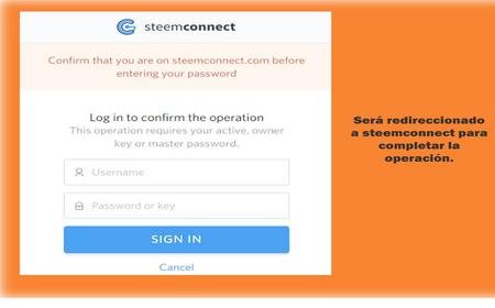 Deberá confirmar que quiere continuar con la operación y luego será redireccionado a steemconnect para completar su operación.