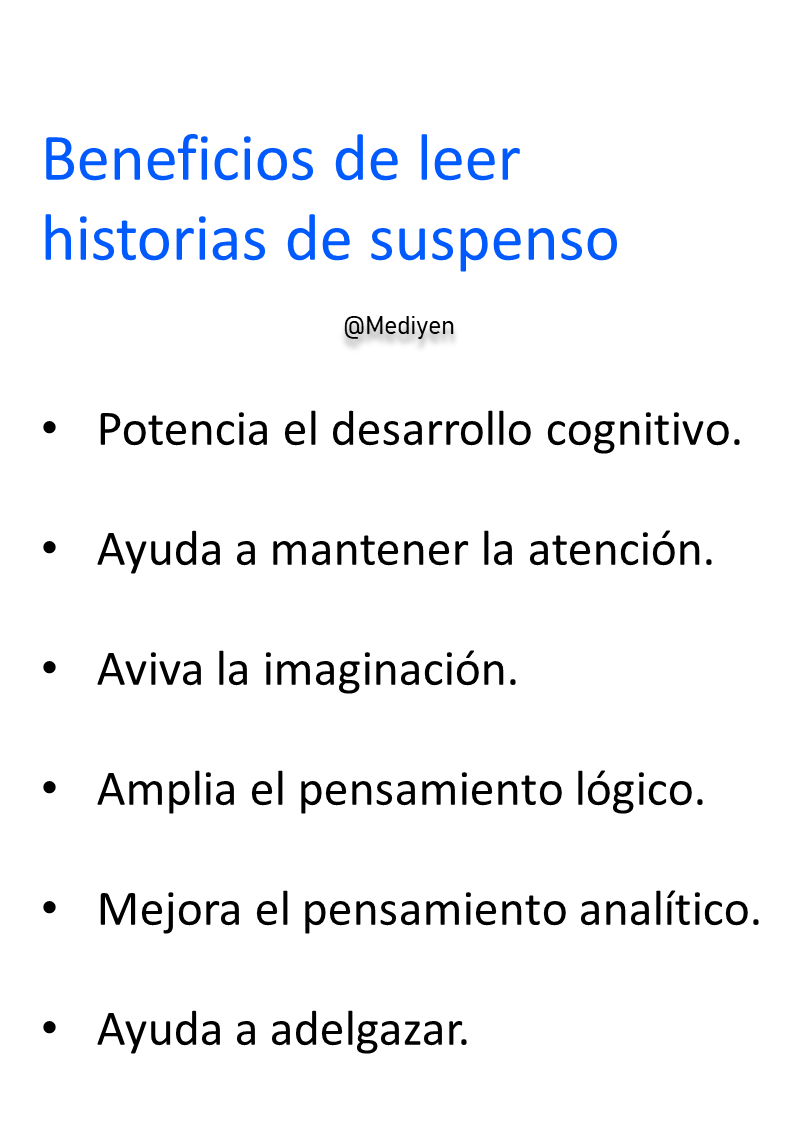 | Hay al menos 6 beneficios que te aporta el leer historias de misterio y suspenso: potencia el desarrollo cognitivo, ayuda a mantener la atención, aviva la imaginación, mejora el pensamiento lógico y el pensamiento analítico y además te ayuda adelgazar, estos son motivos bastante aceptables para mí. ¿Tú que opinas? There are at least 6 benefits of reading mystery and suspense stories: it boosts cognitive development, helps maintain attention span, enlivens the imagination, improves logical thinking and analytical thinking and also helps you lose weight, these are all pretty acceptable reasons for me. What do you think? |