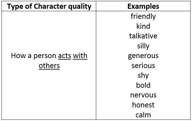 It is important to think about and plan a description of a person before you start writing. Character qualities are words that tell us what kind of person someone is. One type of character quality tells how someone acts with others. Character qualities also tell what a person is like most of the time.