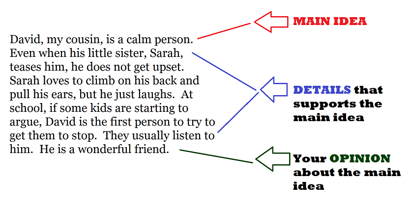 Look at how the following description of David is organized. Notice that his name and character quality (the main idea) are in the first sentence. The second and third sentences describe a detail about the main idea. The fourth and fifth sentences describe another detail. The last sentence tells the author's opinion of David: