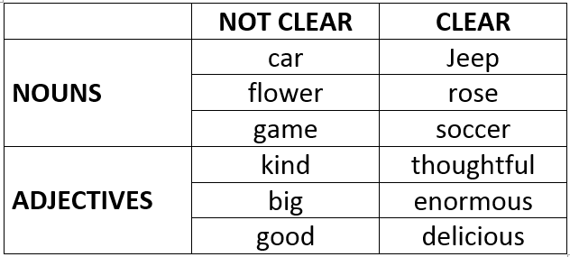 These are examples of exact nouns and adjectives. See how the exact words make it easier to picture what is being described: