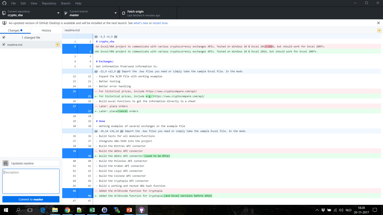 So Git basically 1) helps me tracking changes in your code and 2) gives me the ability to go back to earlier versions of that code. So I got myself an account at GitHub, and created a new project called crypto_vba. Step one was to create a readme.md file and make a small description of the project.