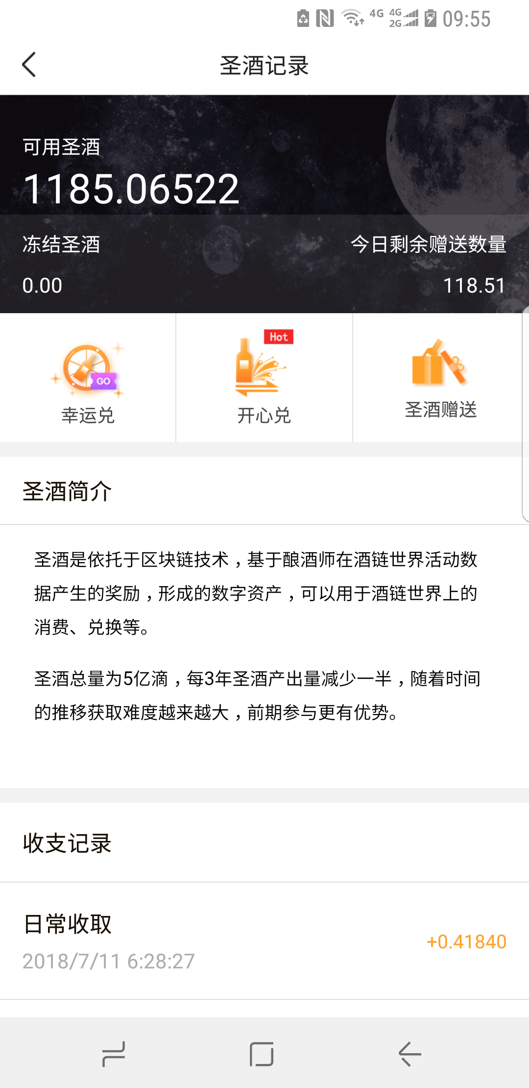 点开酒链世界app,可以显示鸟叔手机挖了多少,它的token就是收益叫圣酒,刚开始玩的时候每天能收20-30滴,随着时间的推移,圣酒收益越来越少。