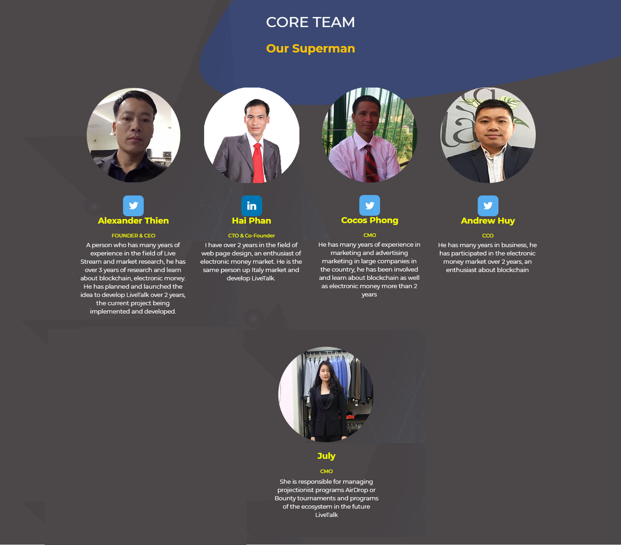 Livetalk, bir yayın sistemidir. Dünyada bir yayın getirmelerine, bir araya getirerek, oyunun ekosisteminin canlı yayınını oluştururken, EDM olayları içeren vericinin sistemlerini ödeyerek kazanmanızı sağlayan, sisteminize ve turnuva oyunlarına Token alabiliyorsunuz.